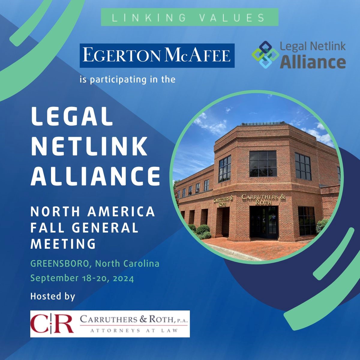Egerton McAfee is happy to announce that we will be attending Legal Netlink Alliance’s US Fall General Meeting, hosted in Greensboro, North Carolina by our friends, Carruthers & Roth, P.A.